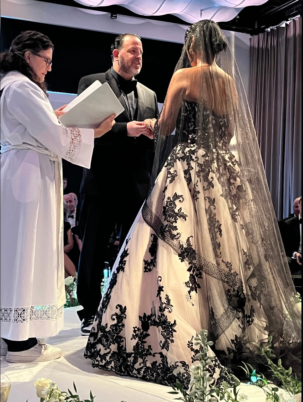 Bridal veil is handmade with dreamy tulle & a delicate edge of black pearls and black beading.