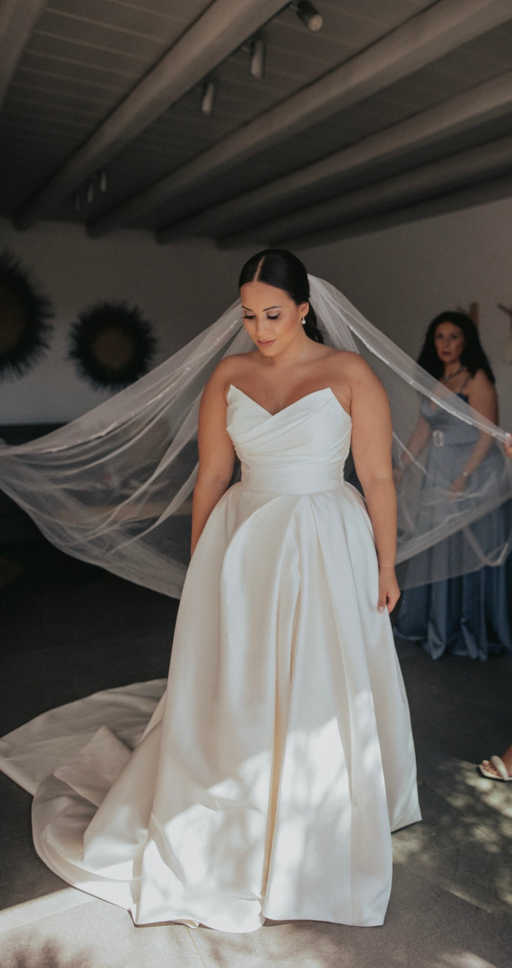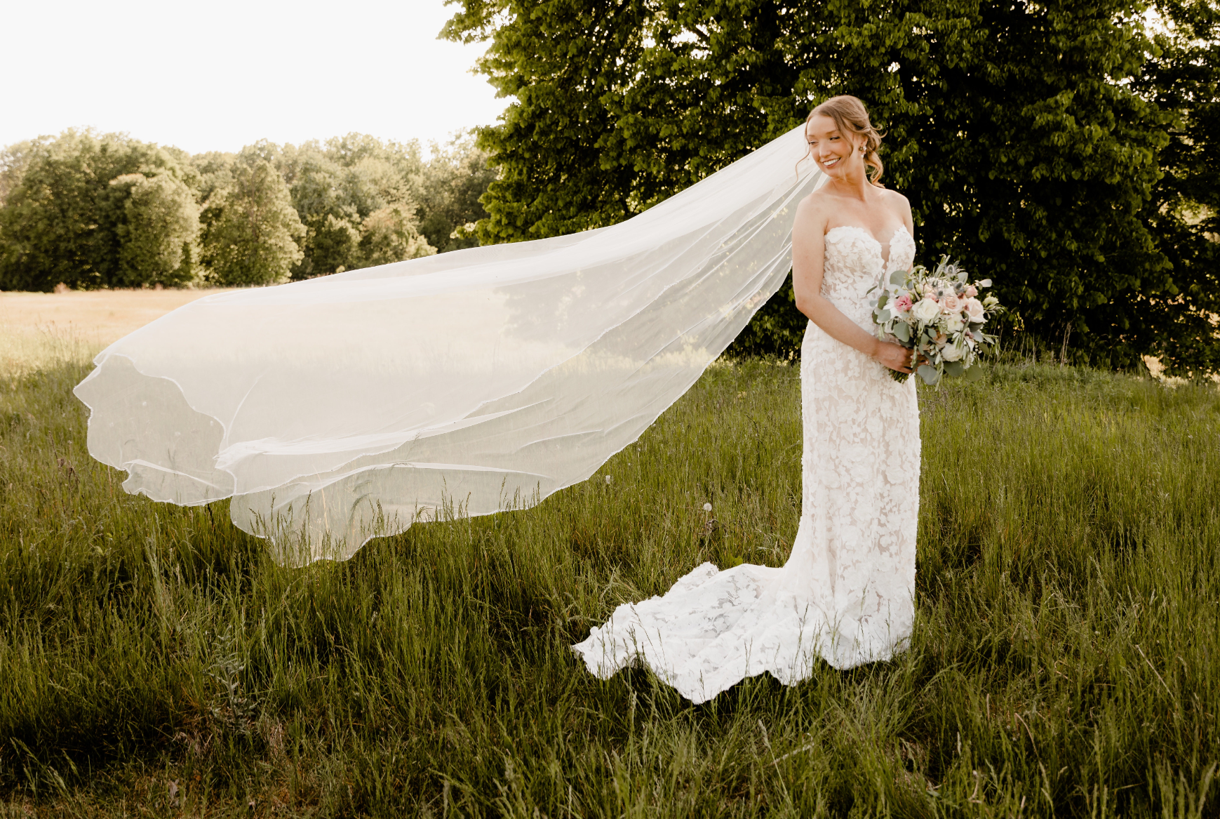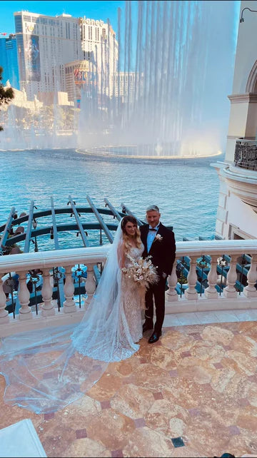 For an elegant and sophisticated look, consider a single-tier cathedral veil made of soft and sheer tulle fabric. The edges of the veil are embellished with small crystals and beads.